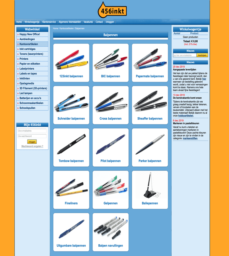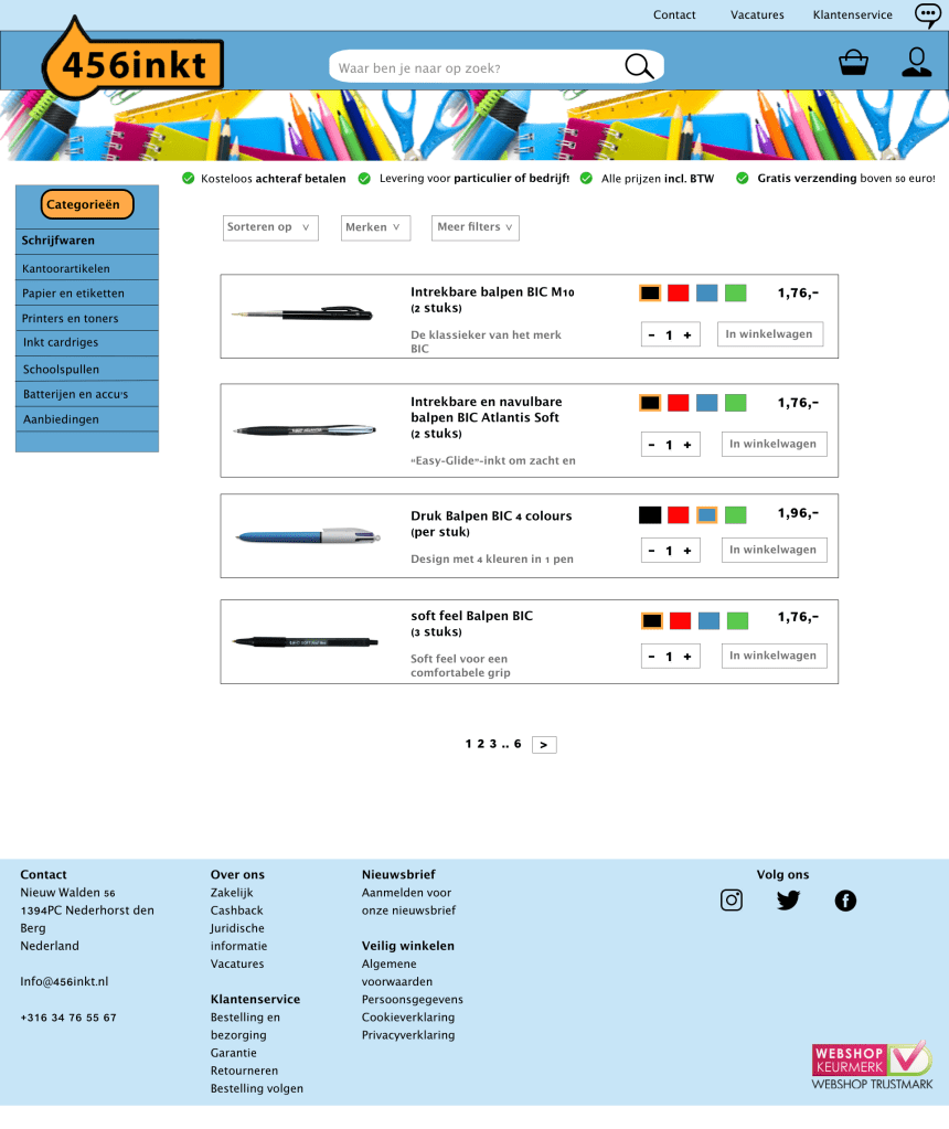 Voorheen (rechts) waren er 14 losse pennencategorieën (binnen hoofdcategorie kantoorartikelen) met elk 1–10 producten, wat onoverzichtelijk was voor oriënterende klanten. Nu valt ‘pennen’ onder de categorie ‘schrijfwaren’ waarbij kleuren per product geselecteerd kunnen worden, wat het aantal losse items sterk vermindert en het zoeken vergemakkelijkt.