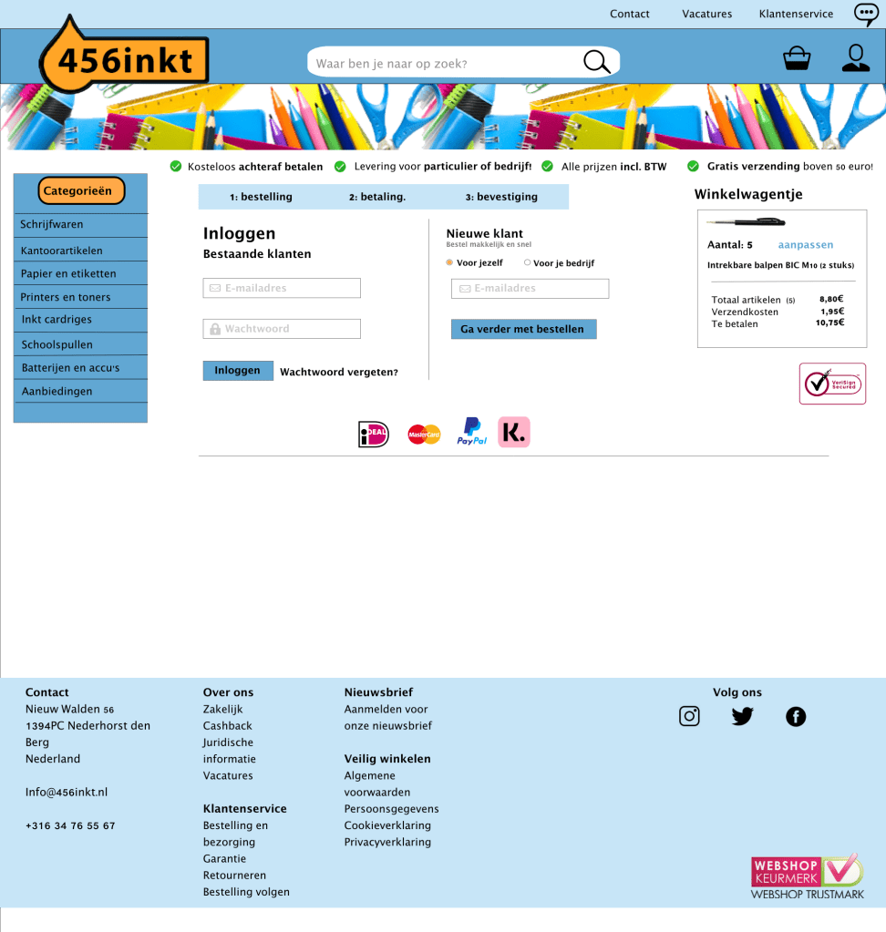 Nieuw: Bestellen in meerdere stappen die het voor de bezoeker makkelijker maken. Niet alle velden (zoals tel. nr) zijn verplicht. Betaalmethodes én keurmerk toegevoegd voor vertrouwen.
