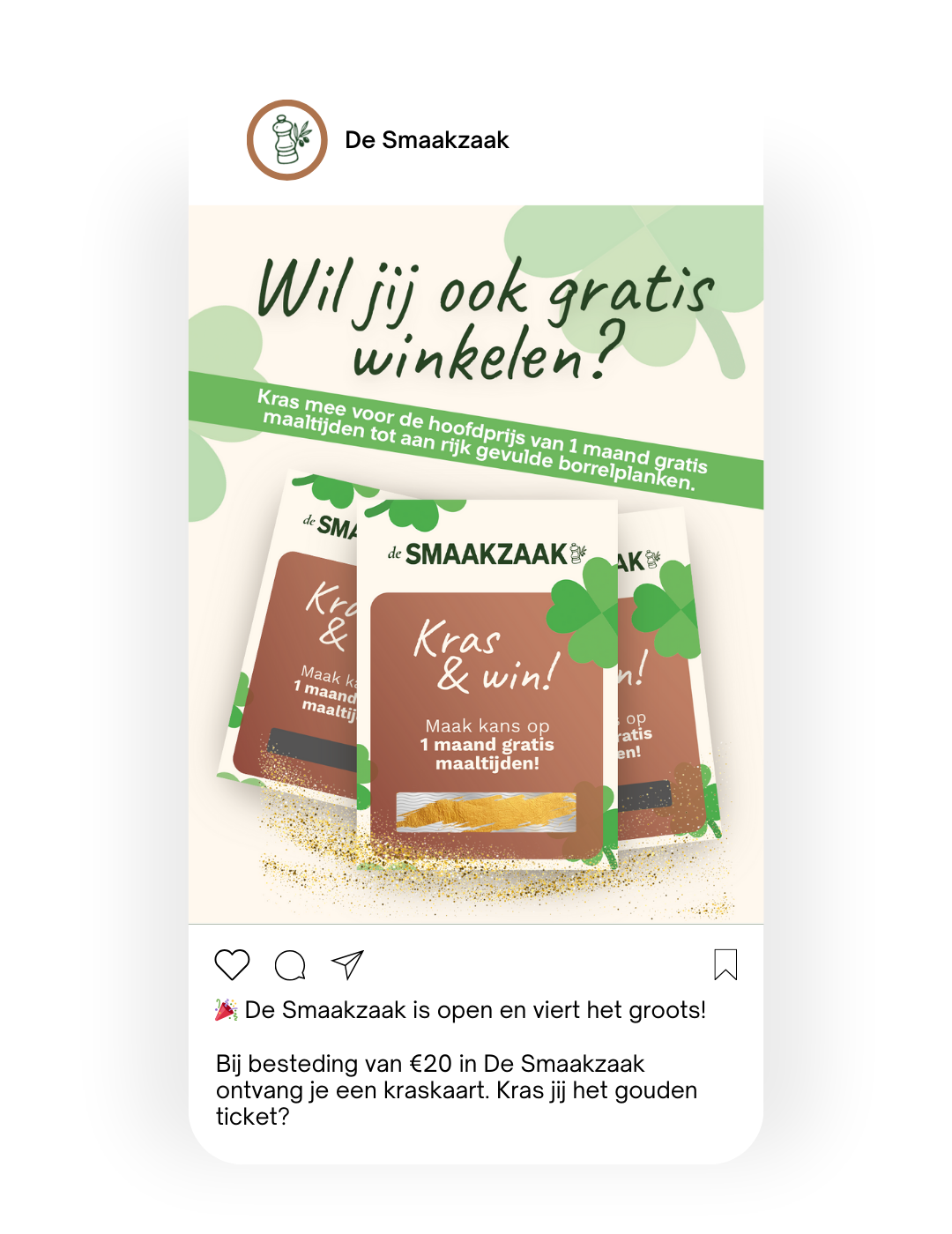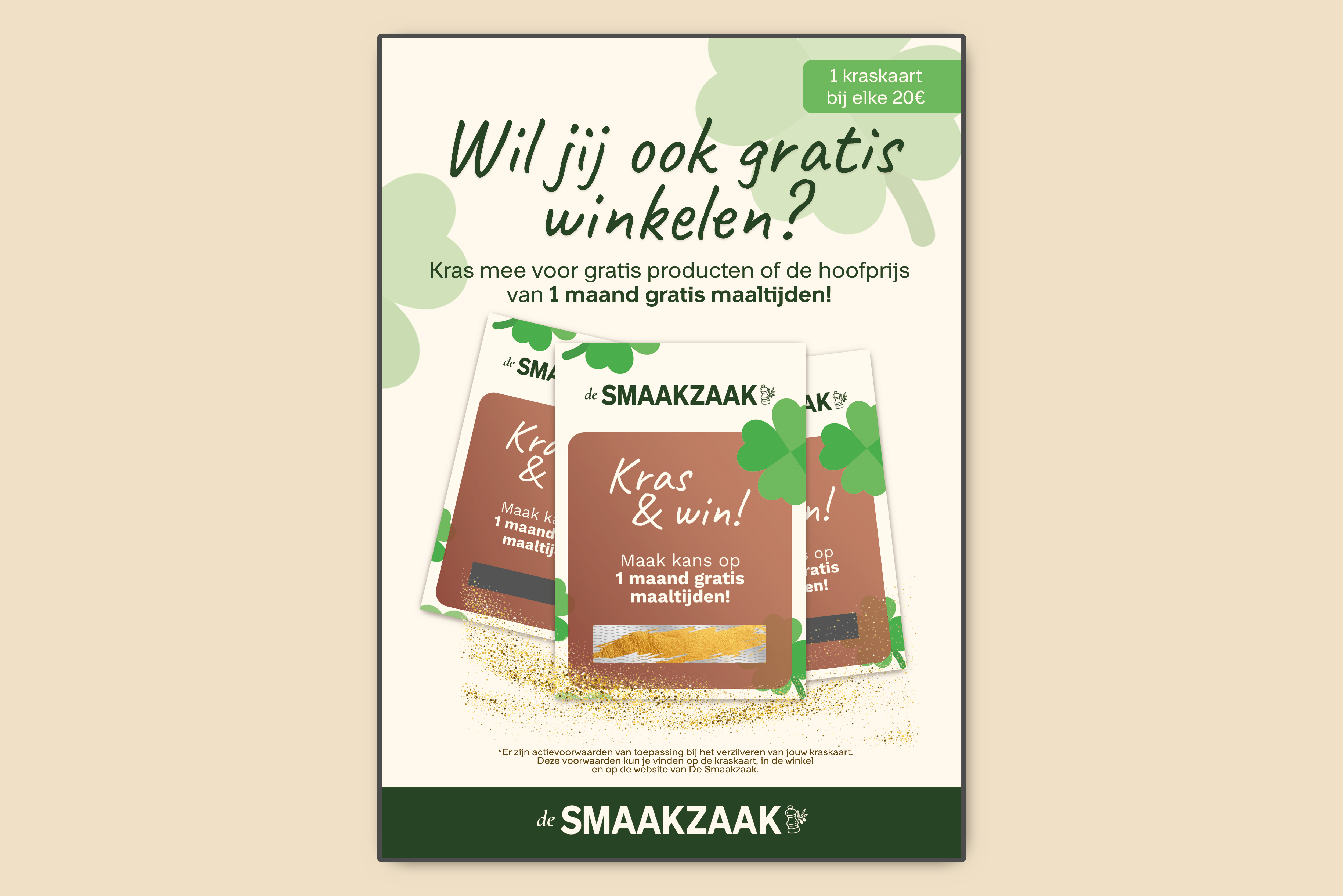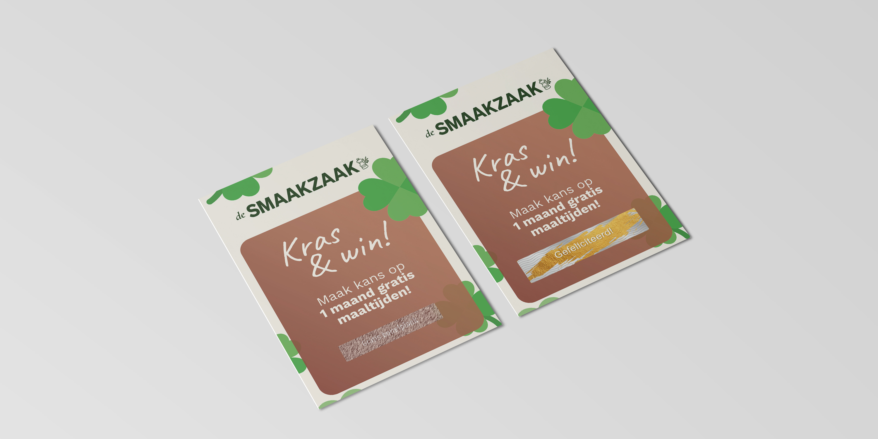 Naast powerpoint templates en andere DTP opdrachten heb ik een promotionele actie voor De Smaakzaak opgezet. Bij Kras & Win maak je bij elke 20 euro aan boodschappen kans op 1 maand gratis maaltijden.